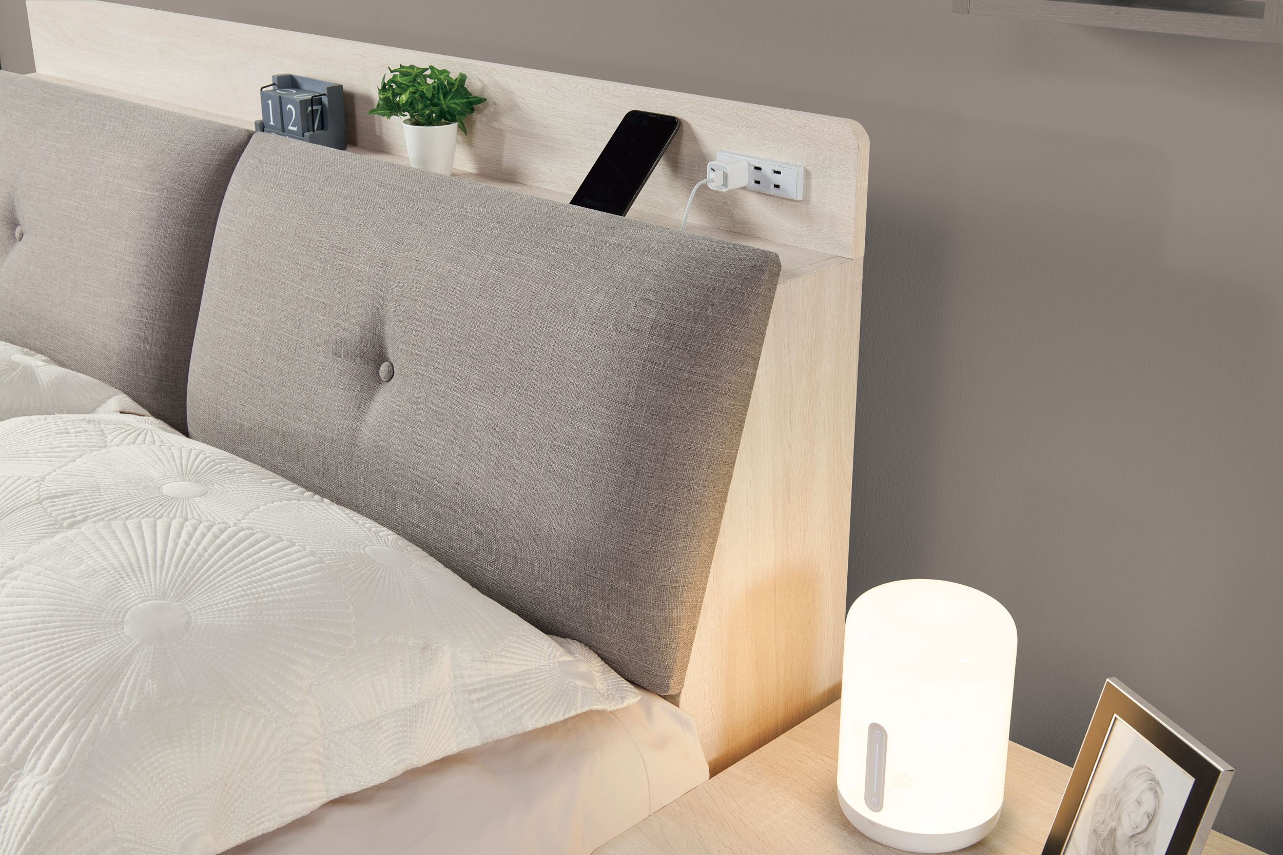 4.床頭:採用高級棉麻布+高密度泡棉(不可拆洗),附插座使用